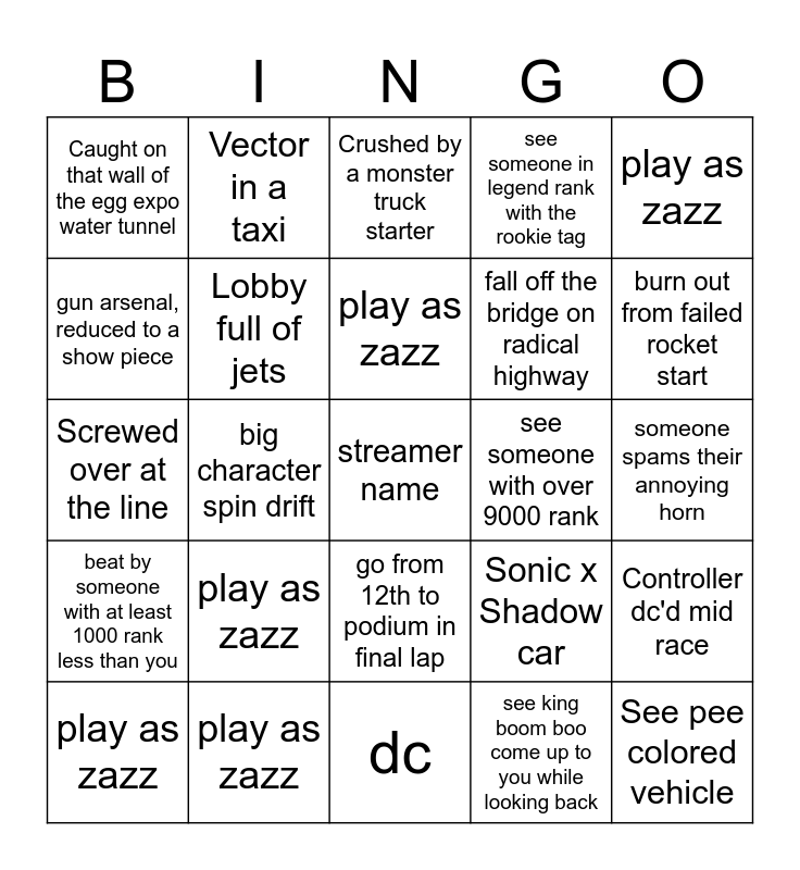 This bingo card has a free space and 24 words: play as zazz, play as zazz, play as zazz, play as zazz, play as zazz, Caught on that wall of the egg expo water tunnel, gun arsenal, reduced to a show piece, Vector in a taxi, see someone with over 9000 rank, go from 12th to podium in final lap, fall off the bridge on radical highway, Screwed over at the line, Sonic x Shadow car, Controller dc'd mid race, Lobby full of jets, see king boom boo come up to you while looking back, someone spams their annoying horn, Crushed by a monster truck starter, burn out from failed rocket start, big character spin drift, See pee colored vehicle, beat by someone with at least 1000 rank less than you, see someone in legend rank with the rookie tag and dc.