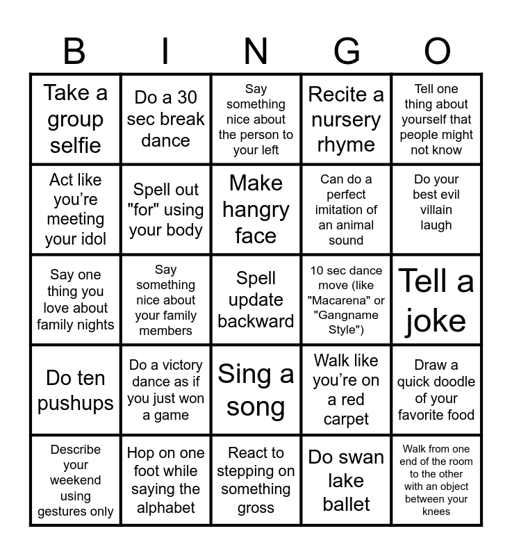 This bingo card has a free space and 39 words: Do a 10-sec Roll Call dance, Create a short team handshake, Create a human shape (e.g. star), Spell out "for" using your body, Describe your weekend using gestures only, Sing a song, Make hangry face, Can do an impression of a celebrity, Tell one thing about yourself that people might not know, Do ten pushups, Say something nice about your family members, Recite a nursery rhyme, Walk from one end of the room to the other with an object between your knees, Tell a joke, 10 sec dance move (like "Macarena" or "Gangname Style"), Do a victory dance as if you just won a game, Stomp your right foot 12 times, Take a group selfie, Make a funny face, Walk like you’re on a red carpet, Act like you’re meeting your idol, React to stepping on something gross, Can do a perfect imitation of an animal sound, Do your best evil villain laugh, Do the nutbush for 30 seconds, do a kookaburra impersonation, Start crying, make the sound of a ambulance, Build a tower using household items in 1 minute, Do a 30 sec break dance, Make a poem about ice cream, Pretend you are a robot, Say something nice about the person to your left, Hop on one foot while saying the alphabet, Do swan lake ballet, Spell your name backward, Draw a quick doodle of your favorite food, Say one thing you love about family nights and Give everyone a high five.