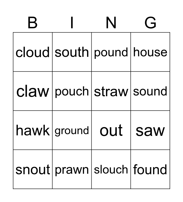 This bingo card has 24 words: loud, couch, sound, yawn, claw, cloud, pouch, south, prawn, bounce, hawk, out, sprout, mouse, straw, shout, slouch, pound, ground, saw, snout, found, house and count.
