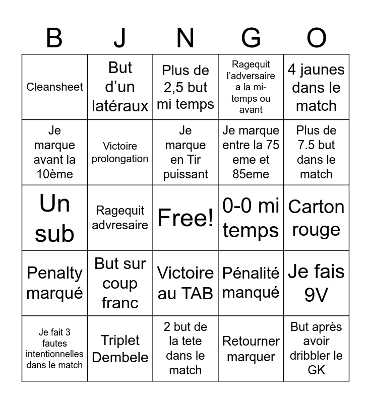This bingo card has a free space and 30 words: Triplet Dembele, Double passe décisive, Ragequit advresaire, Ragequit moi, Cleansheet, Plus de 2,5 but mi temps, Victoire prolongation, Victoire au TAB, 0-0 mi temps, 2 but de la tete dans le match, Carton rouge, But après avoir dribbler le GK, Retourner marquer, Plus de 5,5 but dans le match, Plus de 7.5 but dans le match, 2 poteaux/barres ou plus dans le match, Pénalité manqué, Penalty marqué, But sur coup franc, 4 jaunes dans le match, Un sub, CSC, But d’un latéraux, Je marque entre la 75 eme et 85eme, Je marque avant la 10ème, Ragequit l’adversaire a la mi-temps ou avant, Je fais 9V, Je fait 3 fautes intentionnelles dans le match, Je marque en Tir puissant and Je marque un lob.