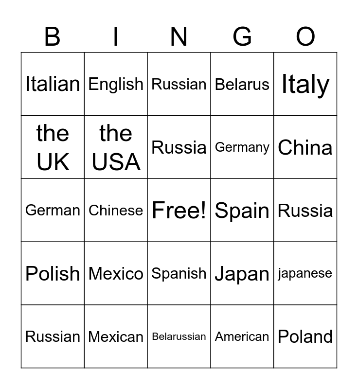 This bingo card has a free space and 24 words: Mexico, Mexican, Russia, Russian, Italy, Italian, the UK, English, Spain, Spanish, Germany, German, Japan, japanese, the USA, American, Russia, Russian, China, Chinese, Poland, Polish, Belarus and Belarussian.