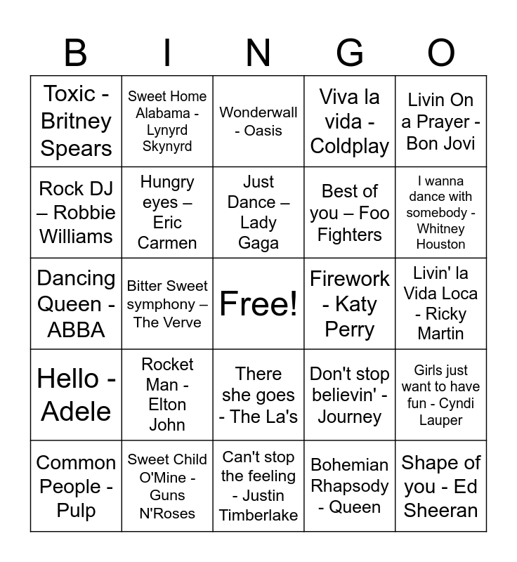 This bingo card has a free space and 43 words: Mr Brightside - The Killers, Shape of you - Ed Sheeran, Good Feeling - Florida, Common People - Pulp, Wannabe - Spice Girls, Bohemian Rhapsody - Queen, Wonderwall - Oasis, Hips Don't Lie - Shakira, Livin On a Prayer - Bon Jovi, Sweet Child O'Mine - Guns N'Roses, Viva la vida - Coldplay, Firework - Katy Perry, There she goes - The La's, Rocket Man - Elton John, Breakfast at Tiffany's - Deep Blue Something, Can't stop the feeling - Justin Timberlake, Hey Jude - The Beatles, Dancing Queen - ABBA, Sweet Caroline - Neil Diamond, I wanna dance with somebody - Whitney Houston, Sweet Home Alabama - Lynyrd Skynyrd, Billie Jean - Michael Jackson, Wake me up - Avicii, Toxic - Britney Spears, It's my life - Bon Jovi, Livin' la Vida Loca - Ricky Martin, Take on me - a-ha, Single Ladies - Beyonce, Don't stop believin' - Journey, Hello - Adele, I want it that way - Backstreet Boys, Girls just want to have fun - Cyndi Lauper, Like a prayer – Madonna, Bitter Sweet symphony – The Verve, All the small things – blink-182, Party I the USA – Miley Cyrus, Year 3000 – Busted, Just Dance – Lady Gaga, Rock DJ – Robbie Williams, Best of you – Foo Fighters, Summer of 69 – Bryan Adams, Hungry eyes – Eric Carmen and Uptown girl – Billy Joel.