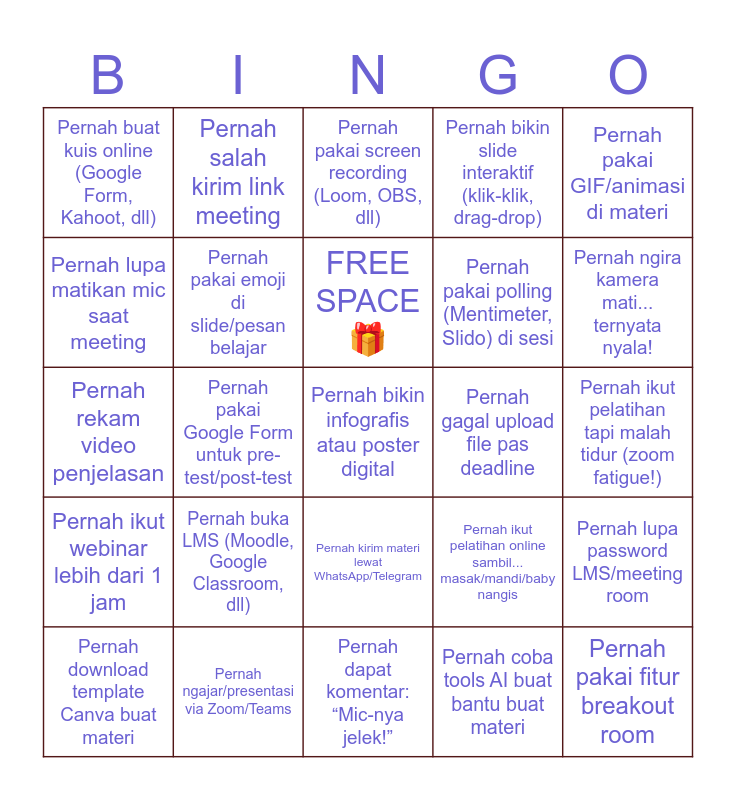 This bingo card has 25 words: Pernah ikut webinar lebih dari 1 jam, Pernah ngajar/presentasi via Zoom/Teams, Pernah bikin infografis atau poster digital, Pernah coba tools AI buat bantu buat materi, Pernah pakai GIF/animasi di materi, Pernah buat kuis online (Google Form, Kahoot, dll), Pernah salah kirim link meeting, Pernah pakai screen recording (Loom, OBS, dll), Pernah gagal upload file pas deadline, Pernah lupa password LMS/meeting room, Pernah lupa matikan mic saat meeting, Pernah pakai emoji di slide/pesan belajar, Pernah dapat komentar: “Mic-nya jelek!”, Pernah ikut pelatihan online sambil... masak/mandi/baby nangis, Pernah ngira kamera mati... ternyata nyala!, Pernah download template Canva buat materi, Pernah pakai Google Form untuk pre-test/post-test, FREE SPACE🎁, Pernah pakai polling (Mentimeter, Slido) di sesi, Pernah ikut pelatihan tapi malah tidur (zoom fatigue!), Pernah rekam video penjelasan, Pernah buka LMS (Moodle, Google Classroom, dll), Pernah kirim materi lewat WhatsApp/Telegram, Pernah bikin slide interaktif (klik-klik, drag-drop) and Pernah pakai fitur breakout room.