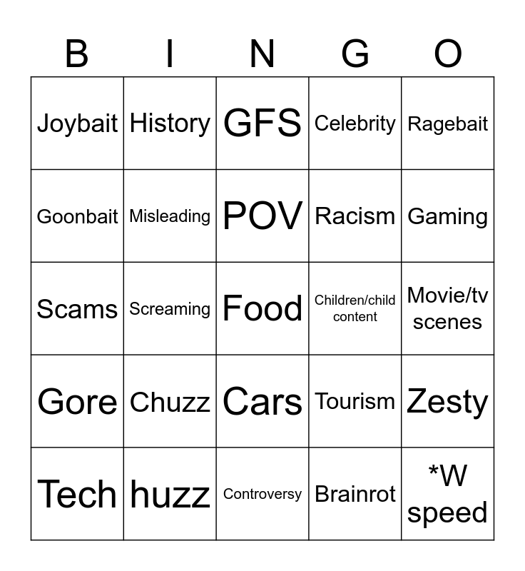 This bingo card has a free space and 24 words: Chuzz, huzz, POV, Tech, Ragebait, Joybait, Goonbait, History, Children/child content, Cars, Racism, Scams, Tourism, Zesty, Misleading, Brainrot, Movie/tv scenes, GFS, Gaming, Screaming, *W speed, Gore, Celebrity and Controversy.