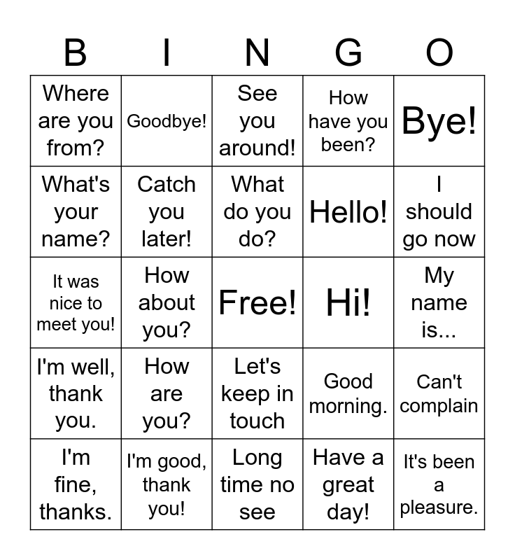 This bingo card has a free space and 24 words: How are you?, I'm good, thank you!, What do you do?, I'm fine, thanks., Bye!, Where are you from?, What's your name?, Goodbye!, Hi!, Let's keep in touch, Hello!, It was nice to meet you!, Good morning., Can't complain, Catch you later!, Have a great day!, My name is..., See you around!, I should go now, How about you?, It's been a pleasure., I'm well, thank you., How have you been? and Long time no see.