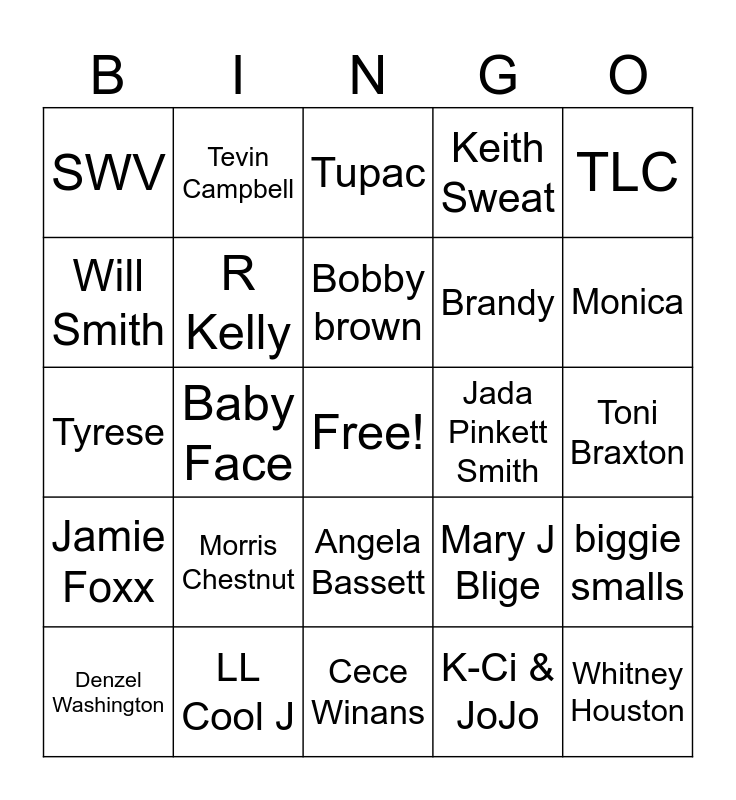 This bingo card has a free space and 29 words: Denzel Washington, Silk, Baby Face, Ginuwine, SWV, Tupac, R Kelly, Morris Chestnut, Jada Pinkett Smith, LL Cool J, Toni Braxton, Whitney Houston, Cece Winans, K-Ci & JoJo, Monica, Boyz II Men, Angela Bassett, Jamie Foxx, TLC, Tyrese, Mary J Blige, Usher, Brandy, Will Smith, Keith Sweat, Tevin Campbell, biggie smalls, Bobby brown and New edition.