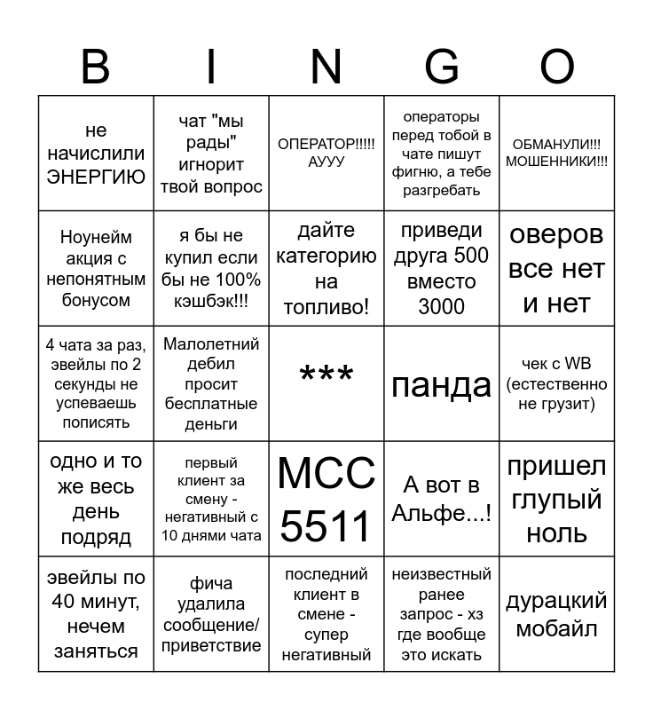This bingo card has a free space and 24 words: первый клиент за смену - негативный с 10 днями чата, фича удалила сообщение/приветствие, дайте категорию на топливо!, эвейлы по 40 минут, нечем заняться, ОБМАНУЛИ!!! МОШЕННИКИ!!!, не начислили ЭНЕРГИЮ, Ноунейм акция с непонятным бонусом, чат "мы рады" игнорит твой вопрос, панда, МСС 5511, приведи друга 500 вместо 3000, 4 чата за раз, эвейлы по 2 секунды не успеваешь пописять, А вот в Альфе...!, пришел глупый ноль, я бы не купил если бы не 100% кэшбэк!!!, неизвестный ранее запрос - хз где вообще это искать, чек с WB (естественно не грузит), ОПЕРАТОР!!!!! АУУУ, оверов все нет и нет, Малолетний дебил просит бесплатные деньги, дурацкий мобайл, одно и то же весь день подряд, операторы перед тобой в чате пишут фигню, а тебе разгребать and последний клиент в смене - супер негативный.