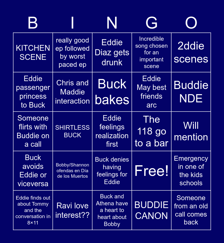This bingo card has 25 words: Bobby/Shannon ofendas en Día de los Muertos, Buck and Athena have a heart to heart about Bobby, Buck bakes, Eddie finds out about Tommy and the conversation in 8×11, 2ddie scenes, KITCHEN SCENE, Eddie passenger princess to Buck, really good ep followed by worst paced ep, The 118 go to a bar, Buck denies having feelings for Eddie, Eddie May best friends arc, Someone flirts with Buddie on a call, Free!, Emergency in one of the kids schools, Chris and Maddie interaction, Someone from an old call comes back, Will mention, Eddie Diaz gets drunk, Buddie NDE, SHIRTLESS BUCK, Eddie feelings realization first, Ravi love interest??, Buck avoids Eddie or viceversa, Incredible song chosen for an important scene and BUDDIE CANON.