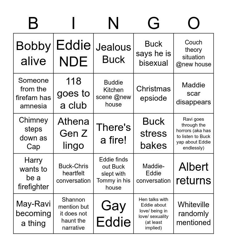 This bingo card has a free space and 24 words: Buck-Chris heartfelt conversation, Shannon mention but it does not haunt the narrative, Buddie Kitchen scene @new house, May-Ravi becoming a thing, Couch theory situation @new house, Bobby alive, Someone from the firefam has amnesia, Eddie NDE, Buck stress bakes, Eddie finds out Buck slept with Tommy in his house, Christmas epsiode, Chimney steps down as Cap, Maddie-Eddie conversation, Albert returns, 118 goes to a club, Hen talks with Eddie about love/ being in love/ sexuality (at least implied), Ravi goes through the horrors (aka has to listen to Buck yap about Eddie endlessly), Jealous Buck, Maddie scar disappears, Athena Gen Z lingo, Whiteville randomly mentioned, Harry wants to be a firefighter, Buck says he is bisexual and Gay Eddie.