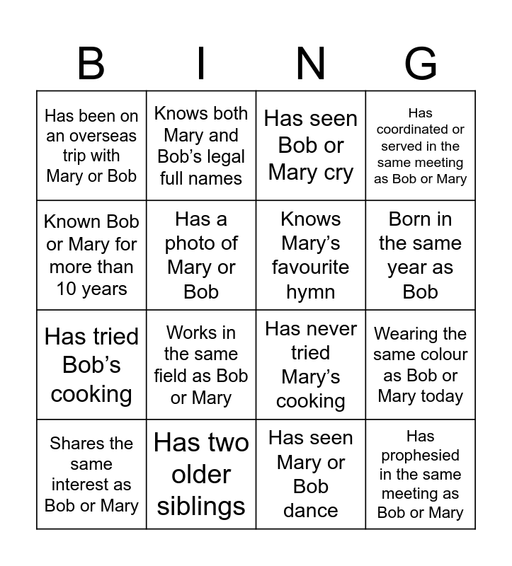 This bingo card has 24 words: Free!, Born on the same day as Mary, Born in the same year as Bob, Born in the same expected month as baby, Known Bob or Mary for more than 10 years, Has been on an overseas trip with Mary or Bob, Has a photo of Mary or Bob, Knows both Mary and Bob’s legal full names, Has two older siblings, Is the eldest in the family, Has tried Bob’s cooking, Has never tried Mary’s cooking, Has been in Mary or Bob’s car, Knows the baby’s name before the baby shower, Knows Mary’s favourite hymn, Knows Bob’s favourite children’s song, Has seen Mary or Bob dance, Has seen Bob or Mary cry, Works in the same field as Bob or Mary, Wearing the same colour as Bob or Mary today, Shares the same interest as Bob or Mary, Has prophesied in the same meeting as Bob or Mary, Has coordinated or served in the same meeting as Bob or Mary and Called “Lord Jesus” today.