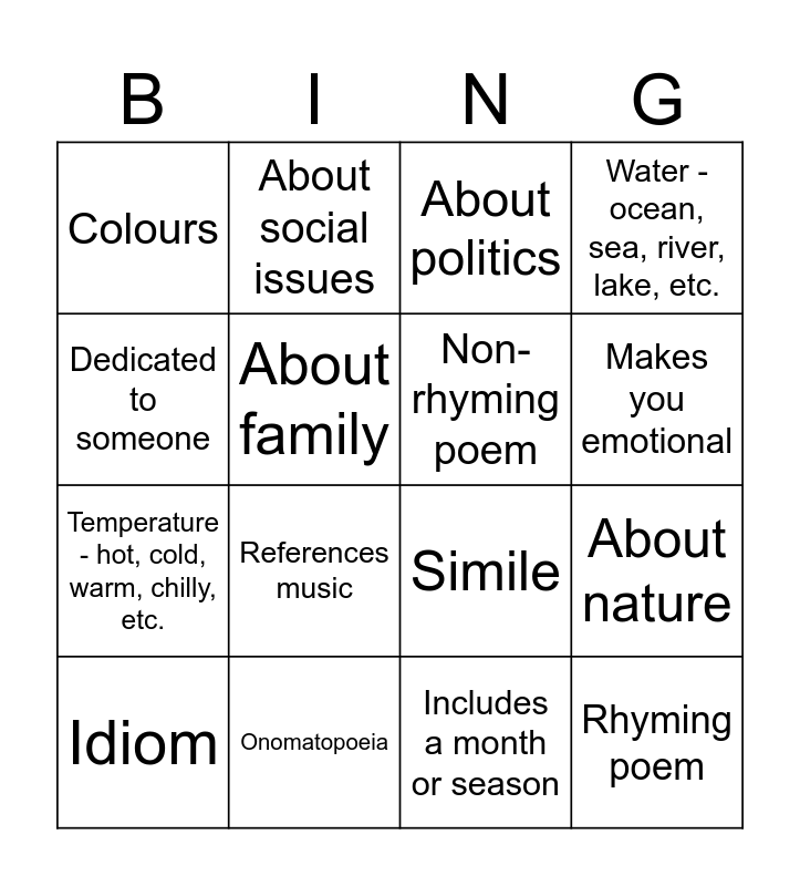 This bingo card has 32 words: Includes the word "poem", "poet", or "poetry", Performer has a stage/pen name, About nature, References a famous writer or written work, Rhyming poem, Non-rhyming poem, Dedicated to someone, About love, About social issues, Makes you laugh, Makes you emotional, About politics, Repetition repetition repetition repetition, Alliteration, Onomatopoeia, Metaphor, Personification, Simile, Mentions an animal, Asks a question, Double entendre, Includes food, Includes a month or season, Romance - kiss, touch, holding hands, etc., Idiom, Water - ocean, sea, river, lake, etc., Temperature - hot, cold, warm, chilly, etc., About family, Colours, About home, Inspires you to write/create art and References music.
