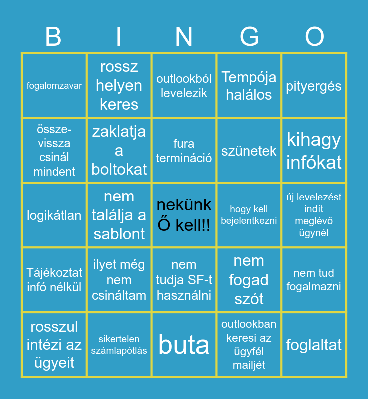 This bingo card has a free space and 24 words: ilyet még nem csináltam, sikertelen számlapótlás, fura termináció, rosszul intézi az ügyeit, pityergés, fogalomzavar, össze-vissza csinál mindent, rossz helyen keres, hogy kell bejelentkezni, nem tudja SF-t használni, szünetek, logikátlan, nem fogad szót, nem tud fogalmazni, zaklatja a boltokat, outlookban keresi az ügyfél mailjét, új levelezést indít meglévő ügynél, outlookból levelezik, kihagy infókat, nem találja a sablont, foglaltat, Tájékoztat infó nélkül, Tempója halálos and buta.
