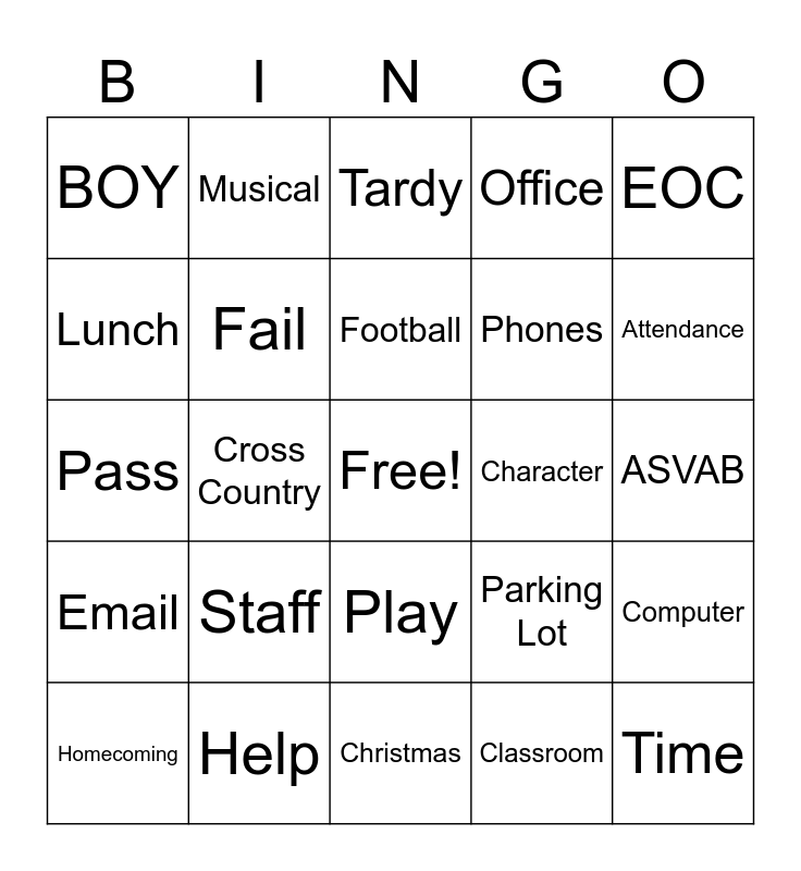 This bingo card has a free space and 25 words: Staff, Christmas, Football, Homecoming, EOC, BOY, Lunch, Musical, Character, Play, Phones, Pass, Parking Lot, Computer, Fail, ACT, ASVAB, Tardy, Attendance, Cross Country, Time, Help, Email, Office and Classroom.