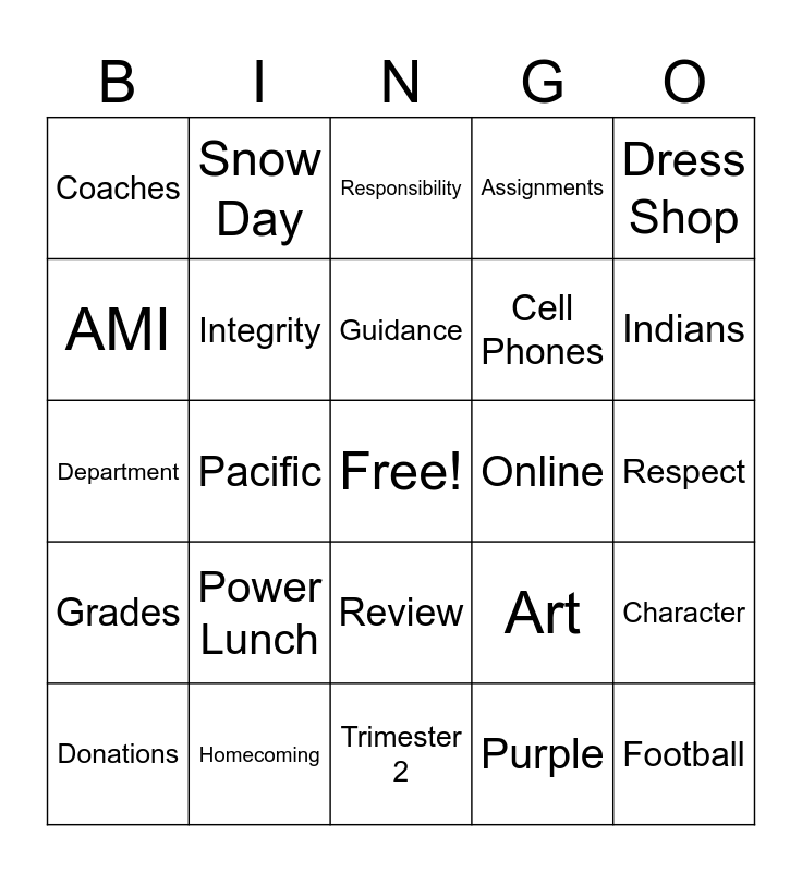 This bingo card has a free space and 25 words: Power Lunch, Trimester 2, Guidance, Donations, Dress Shop, Coaches, AMI, Snow Day, Online, Review, Cell Phones, Department, Art, Character, Integrity, Critical Thinking, Respect, Responsibility, Indians, Pacific, Football, Homecoming, Grades, Assignments and Purple.