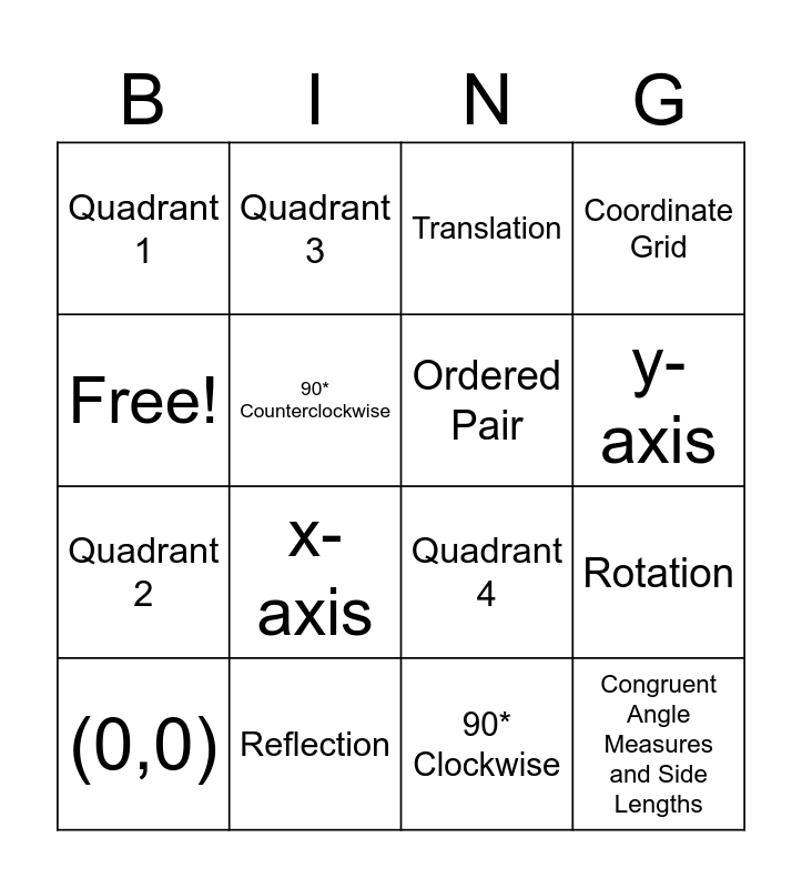 This bingo card has 16 words: Reflection, Rotation, Translation, Quadrant 1, Quadrant 2, Quadrant 3, Quadrant 4, 90* Clockwise, Free!, 90* Counterclockwise, (0,0), Coordinate Grid, x-axis, y-axis, Ordered Pair and Congruent Angle Measures and Side Lengths.