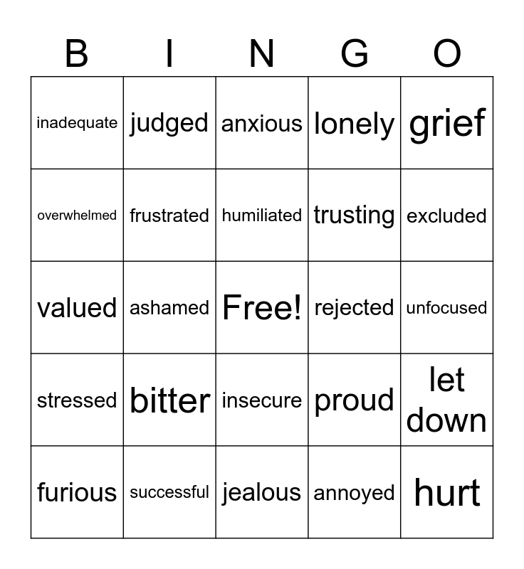 This bingo card has a free space and 37 words: surprised, fearful, disappointed, frustrated, let down, bitter, humiliated, guilty, grief, embarrassed, ashamed, lonely, hurt, unfocused, overwhelmed, stressed, scared, anxious, insecure, rejected, inadequate, excluded, furious, jealous, betrayed, annoyed, judged, empty, angry, criticized, numb, successful, valued, accepted, proud, trusting and courageous.
