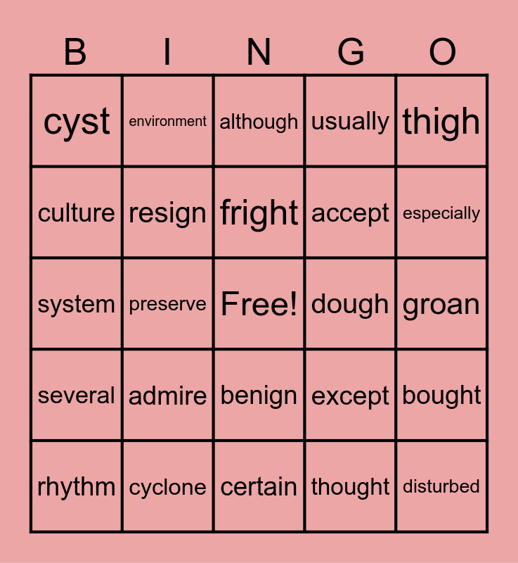 This bingo card has a free space and 24 words: admire, cyclone, fright, rhythm, thigh, cyst, culture, environment, dough, benign, accept, system, except, bought, resign, thought, groan, although, especially, preserve, disturbed, several, usually and certain.