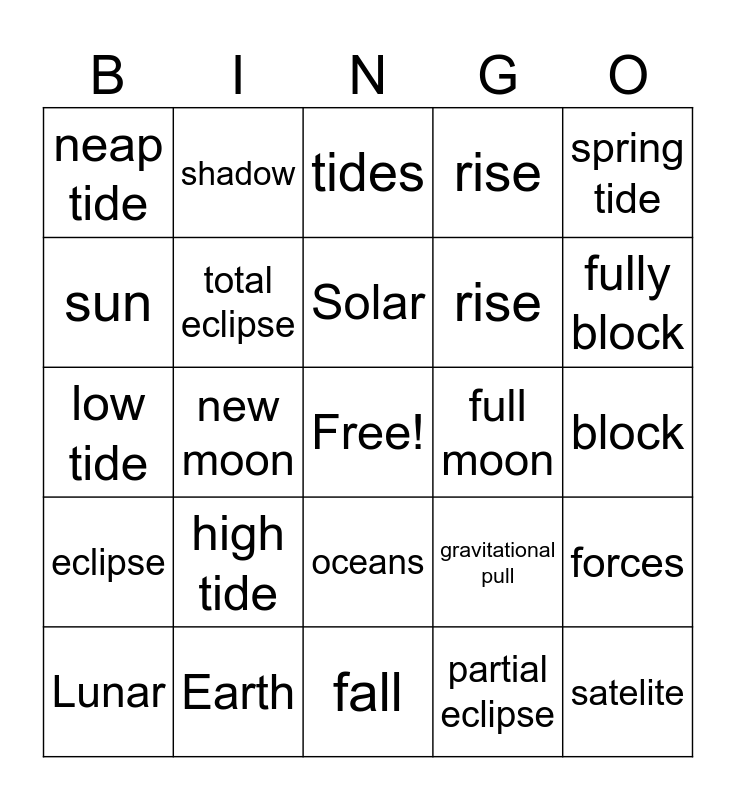 This bingo card has a free space and 24 words: high tide, Earth, Solar, Lunar, spring tide, neap tide, sun, shadow, full moon, oceans, rise, low tide, gravitational pull, forces, total eclipse, partial eclipse, block, tides, fully block, new moon, satelite, eclipse, rise and fall.