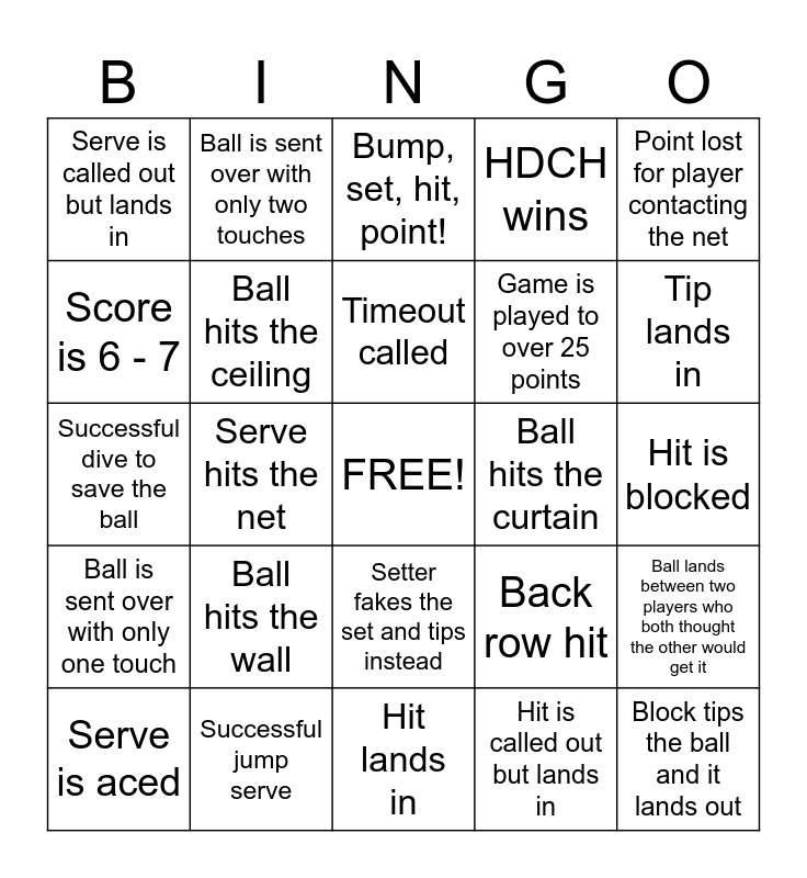 This bingo card has a free space and 29 words: Serve is aced, Serve lands out, Serve hits the net, Serve hits own teammate, Serve is called out but lands in, Bump, set, hit, point!, Ball hits the ceiling, Ball hits the wall, Ball hits the curtain, Successful jump serve, Hit is blocked, Block tips the ball and it lands out, Hit lands in, Hit is called out but lands in, Tip lands in, Tip is blocked, Setter fakes the set and tips instead, Ball is sent over with only one touch, Point lost for player contacting the net, Successful dive to save the ball, Back row hit, Game is won by more than 10 points, Game is played to over 25 points, Score is 6 - 7, HDCH wins, Ball is sent over with only two touches, Ball lands between two players who both thought the other would get it, Timeout called and Libero receives the serve.
