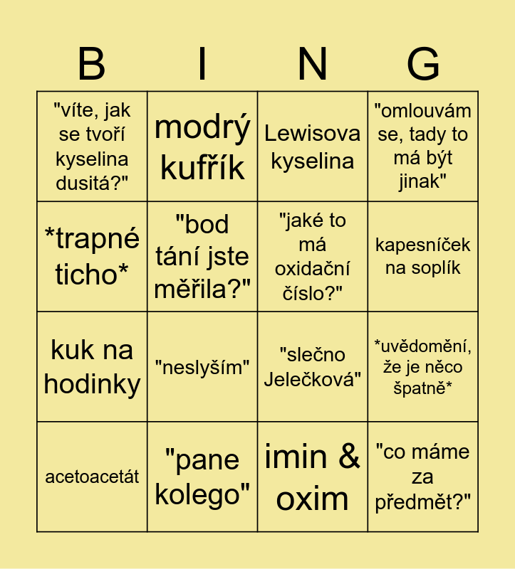 This bingo card has 16 words: "pane kolego", *uvědomění, že je něco špatně*, Lewisova kyselina, "víte, jak se tvoří kyselina dusitá?", kuk na hodinky, modrý kufřík, "slečno Jelečková", imin & oxim, *trapné ticho*, "bod tání jste měřila?", acetoacetát, "omlouvám se, tady to má být jinak", "neslyším", kapesníček na soplík, "jaké to má oxidační číslo?" and "co máme za předmět?".