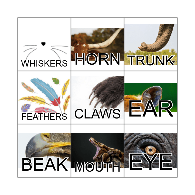 This bingo card has 19 images and 19 words: PAWS, FIN, TRUNK, WING, TAIL, CLAWS, TONGUE, WHISKERS, HORN, EYE, TEETH, EAR, BEAK, NOSE, LEGS, ANTEATER, FEATHERS, MOUTH and FUR.