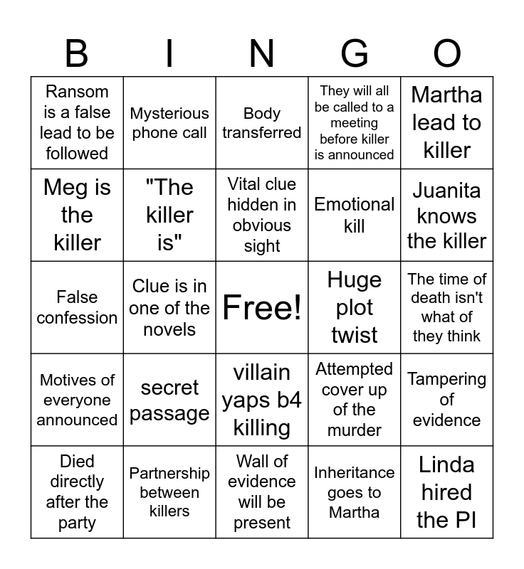 This bingo card has a free space and 24 words: secret passage, Partnership between killers, Vital clue hidden in obvious sight, Died directly after the party, Martha lead to killer, Ransom is a false lead to be followed, Meg is the killer, Mysterious phone call, Huge plot twist, villain yaps b4 killing, Emotional kill, False confession, Attempted cover up of the murder, Tampering of evidence, "The killer is", Inheritance goes to Martha, The time of death isn't what of they think, Body transferred, Juanita knows the killer, Clue is in one of the novels, Linda hired the PI, Motives of everyone announced, They will all be called to a meeting before killer is announced and Wall of evidence will be present.