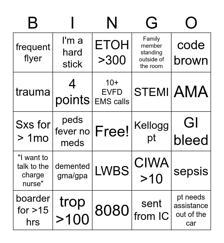 This bingo card has a free space and 24 words: demented gma/gpa, trop >100, 10+ EVFD EMS calls, boarder for >15 hrs, code brown, frequent flyer, trauma, I'm a hard stick, Kellogg pt, LWBS, STEMI, Sxs for > 1mo, CIWA >10, sepsis, 4 points, sent from IC, GI bleed, ETOH >300, AMA, peds fever no meds, pt needs assistance out of the car, "I want to talk to the charge nurse", Family member standing outside of the room and 8080.