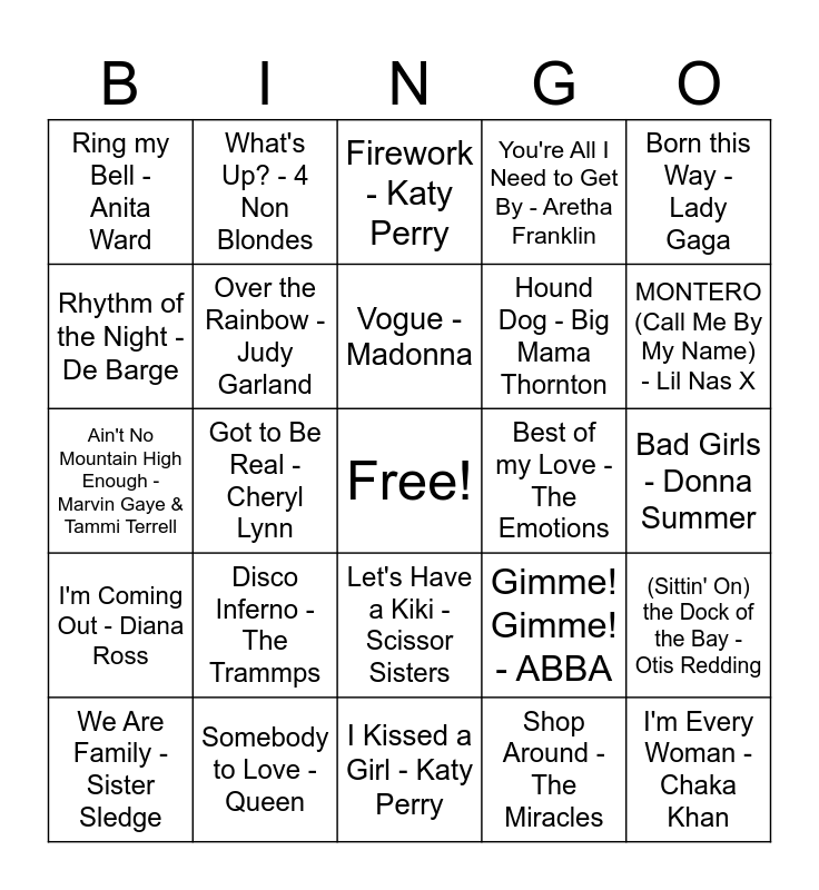 This bingo card has a free space and 39 words: Dancing Queen – ABBA, It’s Raining Men – The Weather Girls, YMCA - The Village People, Over the Rainbow - Judy Garland, We Are Family - Sister Sledge, Let's Have a Kiki - Scissor Sisters, Vogue - Madonna, I Will Survive - Gloria Gaynor, Born this Way - Lady Gaga, I'm Coming Out - Diana Ross, Got to Be Real - Cheryl Lynn, You're All I Need to Get By - Aretha Franklin, I'm Every Woman - Chaka Khan, Bad Girls - Donna Summer, Best of my Love - The Emotions, Disco Inferno - The Trammps, Le Freak - CHIC, Ring my Bell - Anita Ward, Don't Leave Me this Way - Thelma Houston, Gimme! Gimme! - ABBA, Rhythm of the Night - De Barge, I Kissed a Girl - Katy Perry, Hound Dog - Big Mama Thornton, MONTERO (Call Me By My Name) - Lil Nas X, Don't Stop Me Now - Queen, Under Pressure - Queen & David Bowie, Let's Dance - David Bowie, 9 to 5 - Dolly Parton, Tainted Love - Soft Cell, What's Up? - 4 Non Blondes, Supermodel (You Better Work) - RuPaul, Old Town Road - Lil Nas X, Firework - Katy Perry, Somebody to Love - Queen, Shop Around - The Miracles, My Guy - Aretha Franklin, (Sittin' On) the Dock of the Bay - Otis Redding, Ain't No Mountain High Enough - Marvin Gaye & Tammi Terrell and These Boots Are Made for Walkin' - Nancy Sinatra.