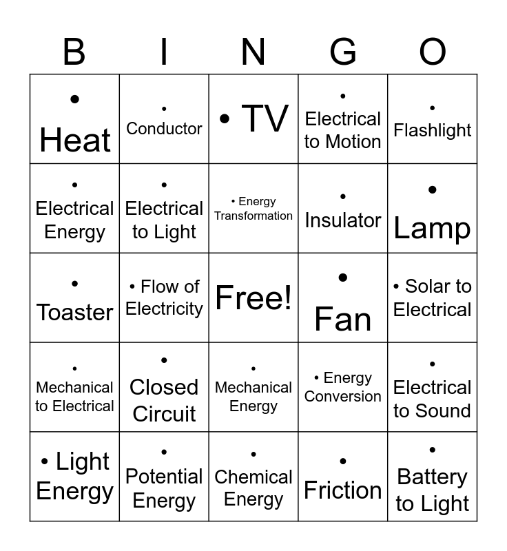 This bingo card has a free space and 48 words: • Battery, • Battery to Light, • Bulb Lights Up, • Chemical Energy, • Closed Circuit, • Computer, • Conductor, • Electric Motor, • Electrical Energy, • Electrical to Heat, • Electrical to Light, • Electrical to Motion, • Electrical to Sound, • Energy Conversion, • Energy Source, • Energy Transfer, • Energy Transformation, • Fan, • Fan Blades Spin, • Flashlight, • Flow of Electricity, • Friction, • Heat, • Insulator, • Kinetic Energy, • Lamp, • Light Energy, • Light to Heat, • Mechanical Energy, • Mechanical to Electrical, • Mechanical to Sound, • Microwave, • Motion, • Open Circuit, • Potential Energy, • Radio, • Solar Panel, • Solar to Electrical, • Sound Energy, • Sound from Speaker, • Switch, • Switch Turns Off, • TV, • Thermal Energy, • Toaster, • Vibration, • Wind Turbine and • Wires.
