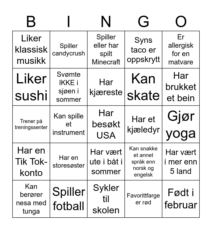 This bingo card has a free space and 29 words: Kan berører nesa med tunga, Har møtt en kjendis, Kan spille et instrument, Har en lillebror, Liker klassisk musikk, Spiller eller har spilt Minecraft, Svømte IKKE i sjøen i sommer, Har en storesøster, Har et kjæledyr, Spiller fotball, Gjør yoga, Født i februar, Sykler til skolen, Favorittfarge er rød, Har brukket et bein, Har krøllete hår, Har vært ute i båt i sommer, Har en Tik Tok-konto, Er allergisk for en matvare, Trener på treningssenter, Kan snakke et annet språk enn norsk og engelsk, Leser manga, Kan skate, Liker sushi, Syns taco er oppskrytt, Spiller candycrush, Har vært i mer enn 5 land, Har kjæreste and Har bodd i en annen by enn Oslo.