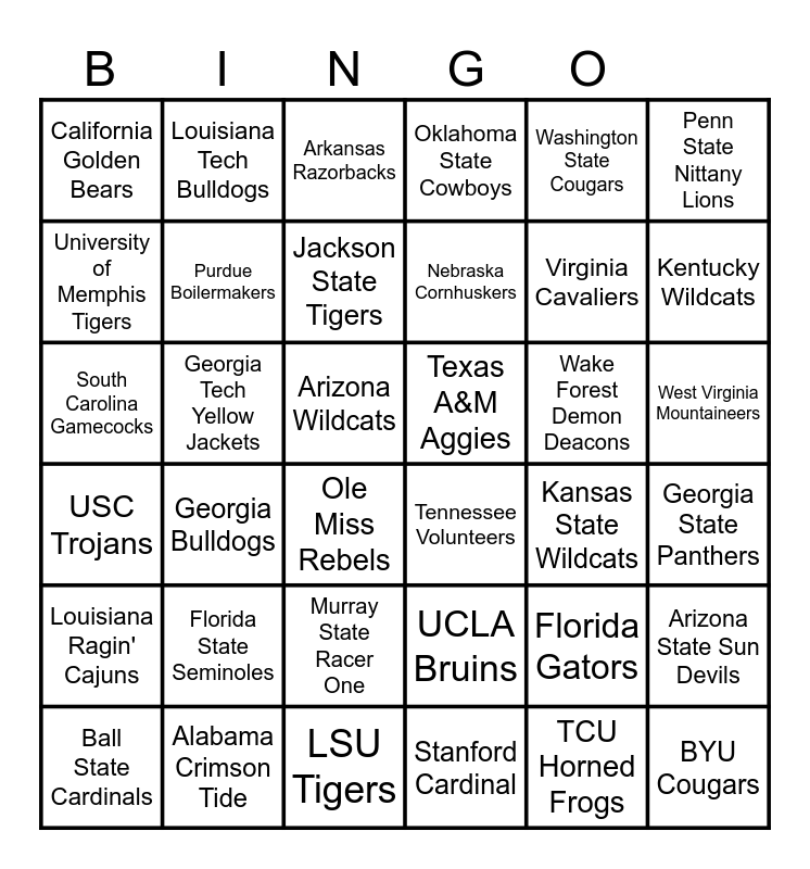 This bingo card has 96 words: Clemson Tigers, Duke Blue Devils, Florida State Seminoles, Georgia Tech Yellow Jackets, Louisville Cardinals, North Carolina Tar Heels, Virginia Tech Hokies, Pittsburgh Panthers, Miami Hurricanes, Indiana Hoosiers, Iowa Hawkeyes, Michigan Wolverines, Michigan State Spartans, Nebraska Cornhuskers, Ohio State Buckeyes, Penn State Nittany Lions, Purdue Boilermakers, Wisconsin Badgers, Texas Longhorns, Baylor Bears, Kansas Jayhawks, Oklahoma Sooners, TCU Horned Frogs, Tx Tech Red Raiders, West Virginia Mountaineers, Kansas State Wildcats, Arizona State Sun Devils, California Golden Bears, Oregon Ducks, Oregon State Beavers, UCLA Bruins, USC Trojans, Washington Huskies, Colorado Buffaloes, Washington State Cougars, Alabama Crimson Tide, Georgia Bulldogs, Auburn Tigers, Florida Gators, Kentucky Wildcats, LSU Tigers, Ole Miss Rebels, South Carolina Gamecocks, Tennessee Volunteers, Texas A&M Aggies, Arkansas Razorbacks, Cincinnati Bearcats, Houston Cougars, SMU Mustangs, Temple Owls, Tulane Green Wave, South Florida Bulls, Rice Owls, UTEP Miners, UTSA Roadrunners, Old Dominion Monarchs, North Texas Mean Green, Ball State Cardinals, Buffalo Bulls, Kent State Golden Flashes, Ohio Bobcats, Toledo Rockets, Air Force Falcons, Colorado State Rams, Hawaii Rainbow Warriors, New Mexico Lobos, Wyoming Cowboys, Nevada Wolf Pack, Appalachian State Mountaineers, Georgia State Panthers, Louisiana Ragin' Cajuns, Texas State Bobcats, Troy Trojans, Notre Dame Fighting Irish, BYU Cougars, Stanford Cardinal, Southern Mississippi Golden Eagles, University of Memphis Tigers, UAB BLAZERS, Jackson State Tigers, Oklahoma State Cowboys, Murray State Racer One, Boston College Eagles, NC State Wolfpack, Syracuse Orange, Virginia Cavaliers, Wake Forest Demon Deacons, Army Black Knights, East Carolina Pirates, Arizona Wildcats, Utah Utes, Ilinois Fighting Illini, Mississippi State Bulldogs, Minnesota Golden Gophers, Louisiana Tech Bulldogs and Missouri Tigers.