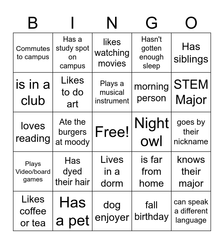 This bingo card has a free space and 24 words: Has dyed their hair, Has a pet, Plays a musical instrument, Likes coffee or tea, Has siblings, Commutes to campus, is in a club, Has a study spot on campus, Night owl, Lives in a dorm, morning person, loves reading, is far from home, knows their major, Likes to do art, fall birthday, goes by their nickname, likes watching movies, STEM Major, Ate the burgers at moody, can speak a different language, Plays Video/board games, Hasn't gotten enough sleep and dog enjoyer.