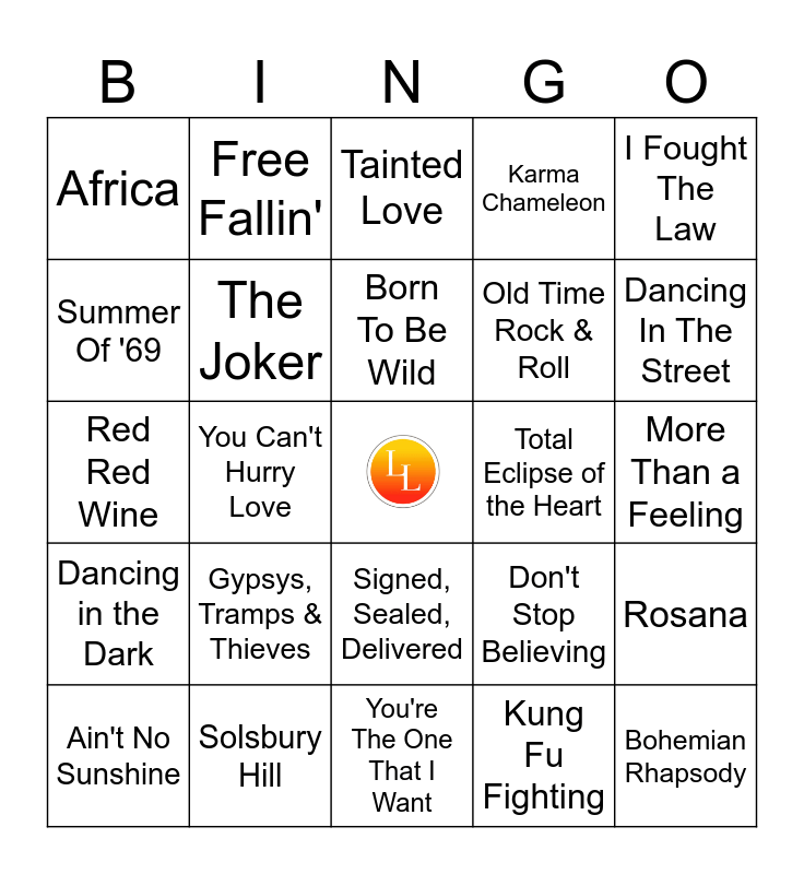 This bingo card has a free space and 44 words: Sweet Dreams (Are made of these), Bohemian Rhapsody, Hotel California, Ain't No Sunshine, Should I Stay or Should Go, Kung Fu Fighting, Tainted Love, Message In A Bottle, I Fought The Law, Solsbury Hill, Karma Chameleon, Total Eclipse of the Heart, Signed, Sealed, Delivered, Gypsys, Tramps & Thieves, Sweet Home Alabama, You're The One That I Want, Island In The Stream, Red Red Wine, Don't Worry Be Happy, Dancing In The Street, Free Fallin', Faith, Rocket Man, Africa, Jessie's Girl, More Than a Feeling, The Power of Love, Go Your Own Way, Don't Stop Believing, Dancing in the Dark, American Pie, Rosana, Sweet Caroline, My Sharona, You Can't Hurry Love, Bad Moon Rising, We Built This City, Kokomo, Born To Be Wild, Summer Of '69, Old Time Rock & Roll, You Shook Me All Night Long, The Joker and Down On The Corner.