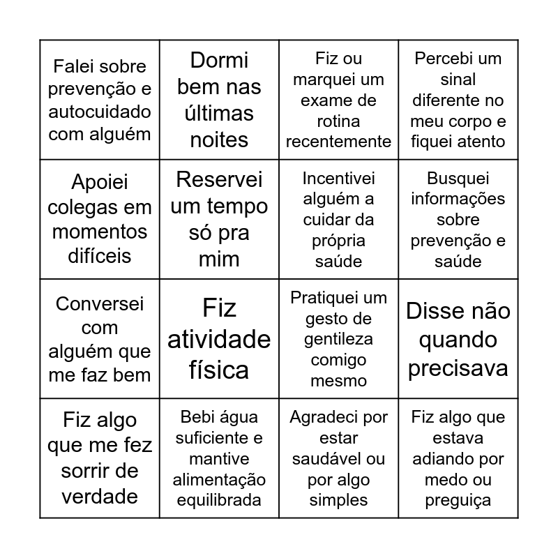 This bingo card has 16 words: Fiz algo que me fez sorrir de verdade, Bebi água suficiente e mantive alimentação equilibrada, Fiz ou marquei um exame de rotina recentemente, Percebi um sinal diferente no meu corpo e fiquei atento, Apoiei colegas em momentos difíceis, Dormi bem nas últimas noites, Pratiquei um gesto de gentileza comigo mesmo, Disse não quando precisava, Falei sobre prevenção e autocuidado com alguém, Reservei um tempo só pra mim, Agradeci por estar saudável ou por algo simples, Busquei informações sobre prevenção e saúde, Conversei com alguém que me faz bem, Fiz atividade física, Incentivei alguém a cuidar da própria saúde and Fiz algo que estava adiando por medo ou preguiça.