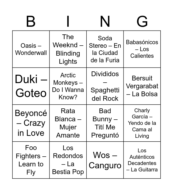 This bingo card has 16 words: Los Redondos – La Bestia Pop, Charly García – Yendo de la Cama al Living, Soda Stereo – En la Ciudad de la Furia, Oasis – Wonderwall, Beyoncé – Crazy in Love, The Weeknd – Blinding Lights, Bad Bunny – Tití Me Preguntó, Wos – Canguro, Duki – Goteo, Arctic Monkeys – Do I Wanna Know?, Foo Fighters – Learn to Fly, Babasónicos – Los Calientes, Rata Blanca – Mujer Amante, Bersuit Vergarabat – La Bolsa, Divididos – Spaghetti del Rock and Los Auténticos Decadentes – La Guitarra.