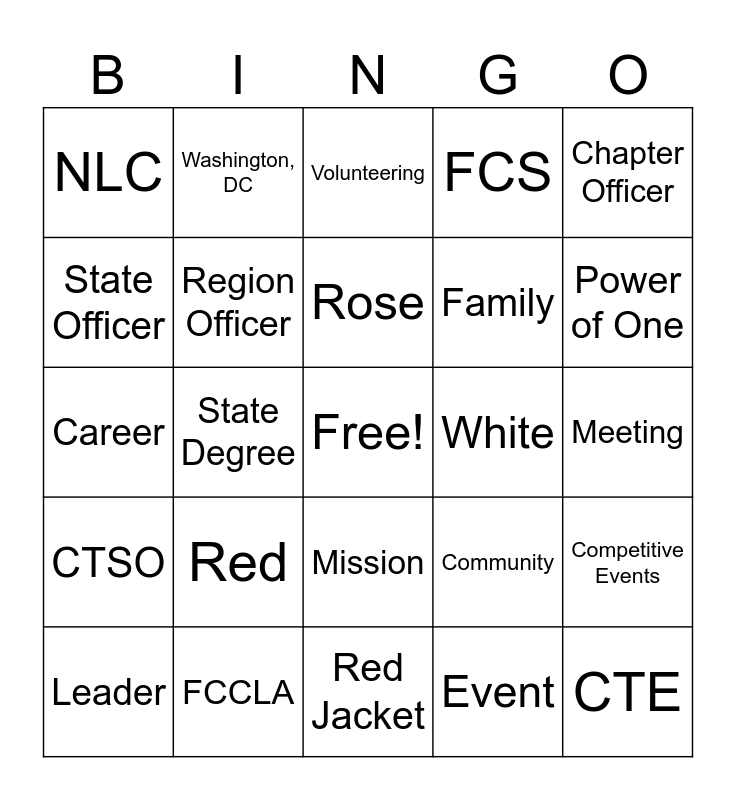 This bingo card has a free space and 24 words: Red, FCCLA, Rose, Leader, Chapter Officer, NLC, State Officer, Washington, DC, White, Mission, Family, Career, Community, Competitive Events, Region Officer, Event, Meeting, Volunteering, Power of One, State Degree, CTE, CTSO, FCS and Red Jacket.