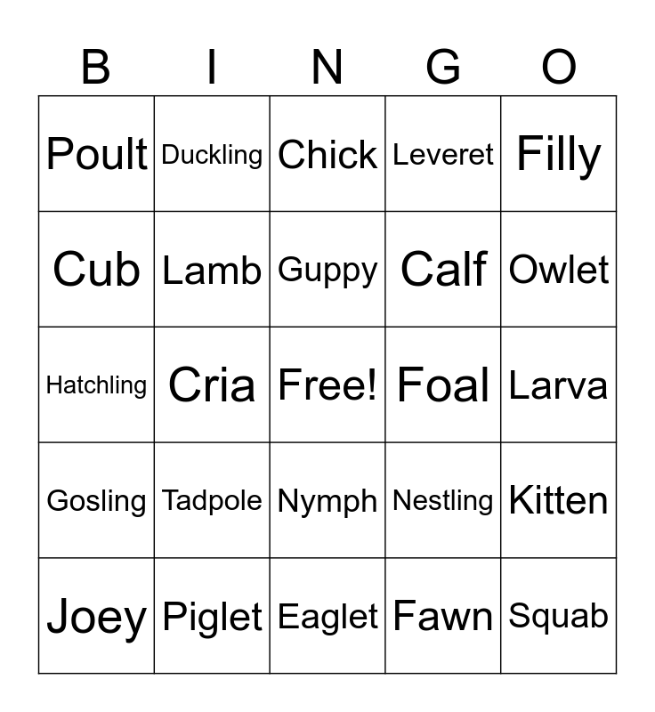 This bingo card has a free space and 28 words: Kitten, Puppy, Calf, Fawn, Cub, Chick, Duckling, Gosling, Foal, Joey, Hatchling, Leveret, Piglet, Eaglet, Owlet, Cygnet, Tadpole, Lamb, Guppy, Nymph, Poult, Puggle, Squab, Cria, Larva, Nestling, Filly and Colt.