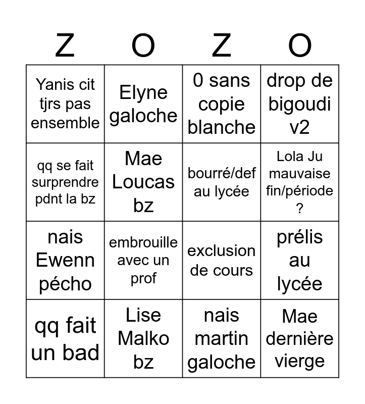 This bingo card has 16 words: Lise Malko bz, prélis au lycée, 0 sans copie blanche, Yanis cit tjrs pas ensemble, nais Ewenn pécho, Elyne galoche, exclusion de cours, nais martin galoche, qq se fait surprendre pdnt la bz, Mae Loucas bz, qq fait un bad, drop de bigoudi v2, embrouille avec un prof, Lola Ju mauvaise fin/période ?, bourré/def au lycée and Mae dernière vierge.
