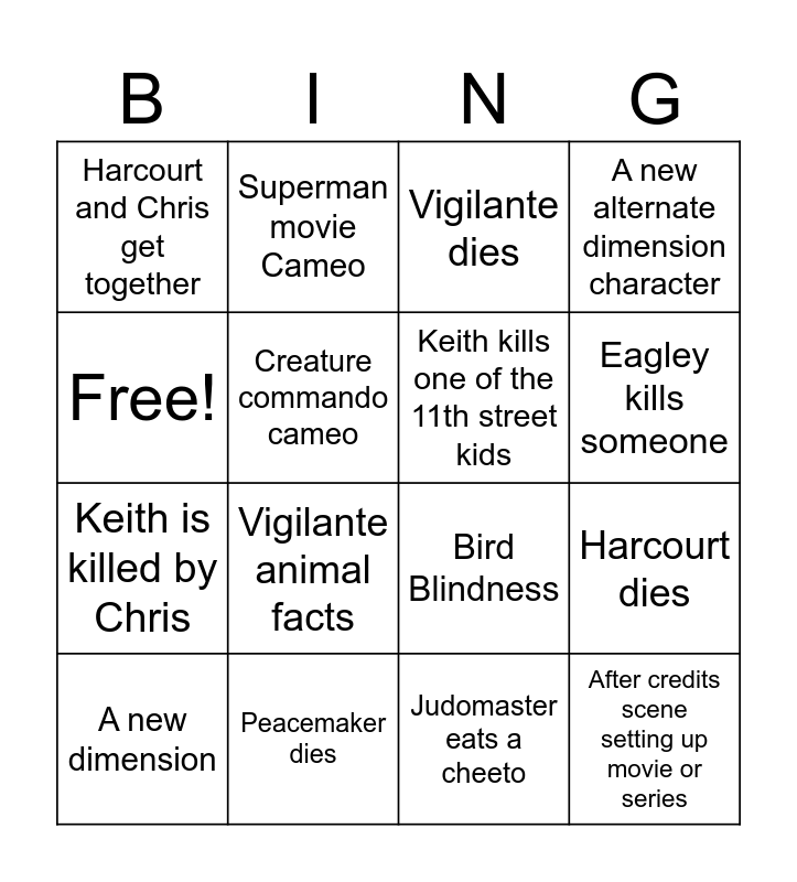This bingo card has 16 words: Peacemaker dies, Harcourt dies, Vigilante dies, Harcourt and Chris get together, Keith is killed by Chris, Superman movie Cameo, Bird Blindness, Judomaster eats a cheeto, Free!, Creature commando cameo, A new dimension, A new alternate dimension character, Vigilante animal facts, Eagley kills someone, Keith kills one of the 11th street kids and After credits scene setting up movie or series.