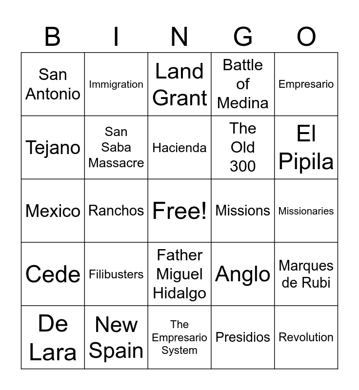 Texas History | Texas History Midterm Review Bingo | The Texas Revolution | Filibusters and Empresarios | Mexican National Era