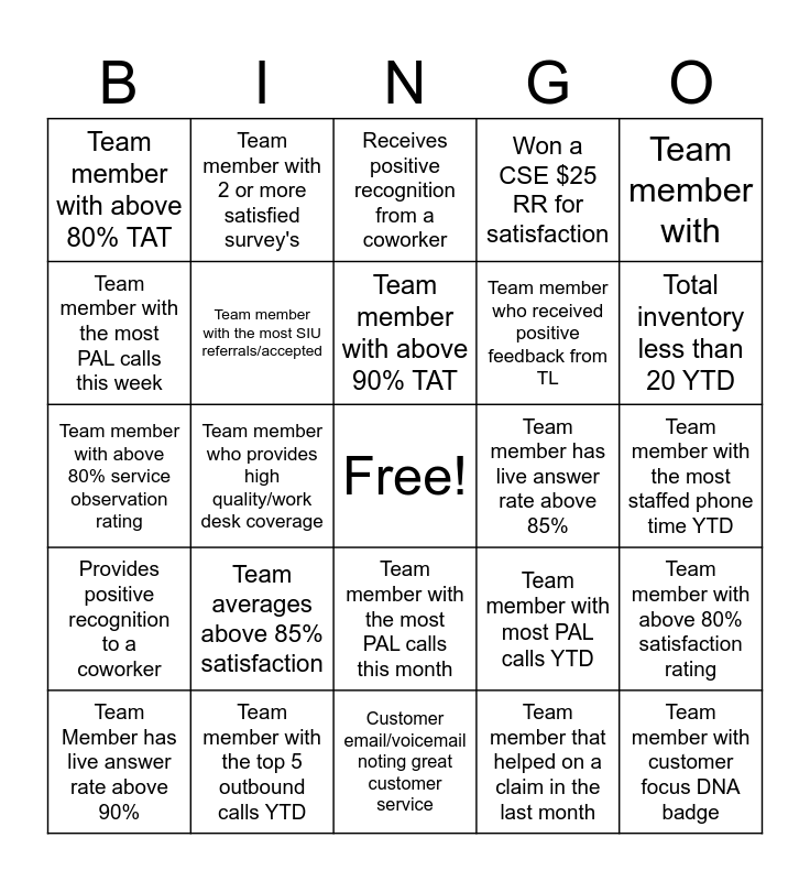 This bingo card has a free space and 24 words: Team Member has live answer rate above 90%, Team averages above 85% satisfaction, Team member with above 90% TAT, Team member that helped on a claim in the last month, Team member with, Team member with above 80% TAT, Team member with 2 or more satisfied survey's, Receives positive recognition from a coworker, Team member has live answer rate above 85%, Team member with the most staffed phone time YTD, Team member with above 80% service observation rating, Team member with the most SIU referrals/accepted, Team member with most PAL calls YTD, Team member with above 80% satisfaction rating, Team member with the most PAL calls this week, Team member with the top 5 outbound calls YTD, Customer email/voicemail noting great customer service, Won a CSE $25 RR for satisfaction, Total inventory less than 20 YTD, Provides positive recognition to a coworker, Team member who provides high quality/work desk coverage, Team member with the most PAL calls this month, Team member who received positive feedback from TL and Team member with customer focus DNA badge.