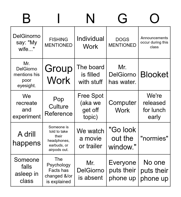 This bingo card has a free space and 29 words: Someone falls asleep in class, Chat GPT/AI is mentioned, Pop Culture Reference, We talk about something completely unrelated, DelGinorno say: "My wife...", Individual Work, Group Work, Someone is told to take their headphones, earbuds, or airpods out., Computer Work, The Psychology Facts has changed &/or is explained, We're released for lunch early, No one puts their phone up, Mr. DelGiorno is absent, Everyone puts their phone up, Blooket, Mr. DelGiorno doesn't have an answer to a question, We watch a movie or trailer, A drill happens, Announcements occur during this class, We recreate and experiment, "Go look out the window.", Mr. DelGiorno has coffee., Mr. DelGiorno has water., Mr. DelGiorno mentions his poor eyesight., DOGS MENTIONED, FISHING MENTIONED, "normies", The board is filled with stuff and The board is completely empty.