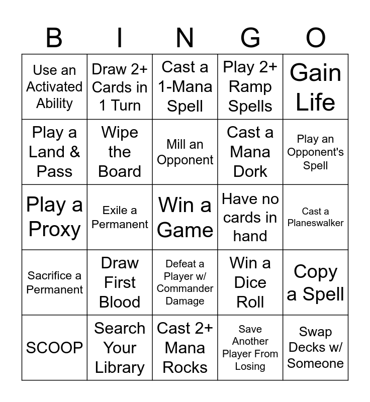 This bingo card has a free space and 39 words: Turn 1 Sol Ring, Enchant a Creature, Counter a Spell, Wipe the Board, SCOOP, Defeat a Player w/ Commander Damage, Mill an Opponent, Discard a Card, Gain Life, Sacrifice a Permanent, Exile a Permanent, Play 2+ Ramp Spells, Swap Decks w/ Someone, Cast a Planeswalker, Have no cards in hand, Draw First Blood, Return a Permanent from Graveyard, Use an Activated Ability, Create 3+ Tokens, Win a Dice Roll, Play a Land & Pass, Cast 2+ Mana Rocks, Cast a Mana Dork, Play an Opponent's Spell, Play a Tutor Spell, Cast Your Commander 2+ Times, Defeat Another Player, Take an Extra Turn, First Non-Combat Damage, Draw 2+ Cards in 1 Turn, Cast a Spell During Opponent's Turn, Have 7+ Lands in Play, Cast a 1-Mana Spell, Search Your Library, Save Another Player From Losing, Equip a Creature, Copy a Spell, Play a Proxy and Pay Your Taxes.