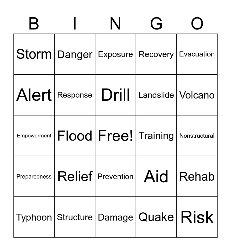 This bingo card has a free space and 47 words: Hazard, Risk, Rescue, Damage, Relief, Safety, Danger, Warning, Alert, Disaster, Response, Recovery, Rehab, Aid, Plan, Map, Drill, Training, Shelter, Evacuation, Flood, Quake, Storm, Landslide, Fire, Volcano, Typhoon, Mitigation, Prevention, Preparedness, Awareness, Resilience, Community, Leader, Policy, Structure, Nonstructural, Education, Capacity, Coordination, Vulnerability, Exposure, Empowerment, Inclusion, Cooperation, Sustainability and Adaptation.