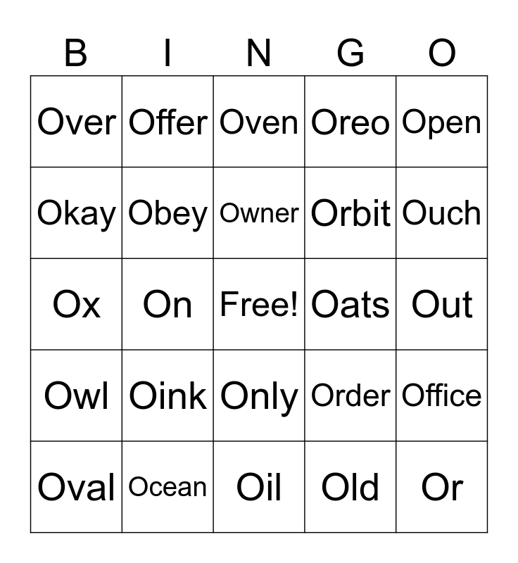 This bingo card has a free space and 29 words: Oval, Octopus, On, Off, Over, Oven, Obey, Oink, Oats, Ocean, Out, Or, Oil, Old, Ouch, Orange, Only, Owl, Open, Ox, Order, Owner, Orbit, Okay, Oreo, Offer, Office, Owner and Organ.