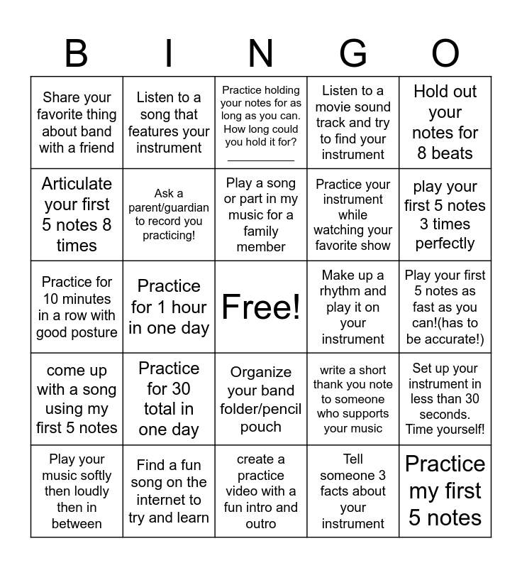 This bingo card has a free space and 24 words: Practice for 30 total in one day, Find a fun song on the internet to try and learn, Play a song or part in my music for a family member, Play your music softly then loudly then in between, Hold out your notes for 8 beats, Share your favorite thing about band with a friend, Articulate your first 5 notes 8 times, Listen to a song that features your instrument, Make up a rhythm and play it on your instrument, Organize your band folder/pencil pouch, Practice your instrument while watching your favorite show, Practice for 10 minutes in a row with good posture, write a short thank you note to someone who supports your music, Set up your instrument in less than 30 seconds. Time yourself!, Ask a parent/guardian to record you practicing!, Tell someone 3 facts about your instrument, Play your first 5 notes as fast as you can!(has to be accurate!), Practice holding your notes for as long as you can. How long could you hold it for?___________, play your first 5 notes 3 times perfectly, Practice for 1 hour in one day, Practice my first 5 notes, come up with a song using my first 5 notes, Listen to a movie sound track and try to find your instrument and create a practice video with a fun intro and outro.