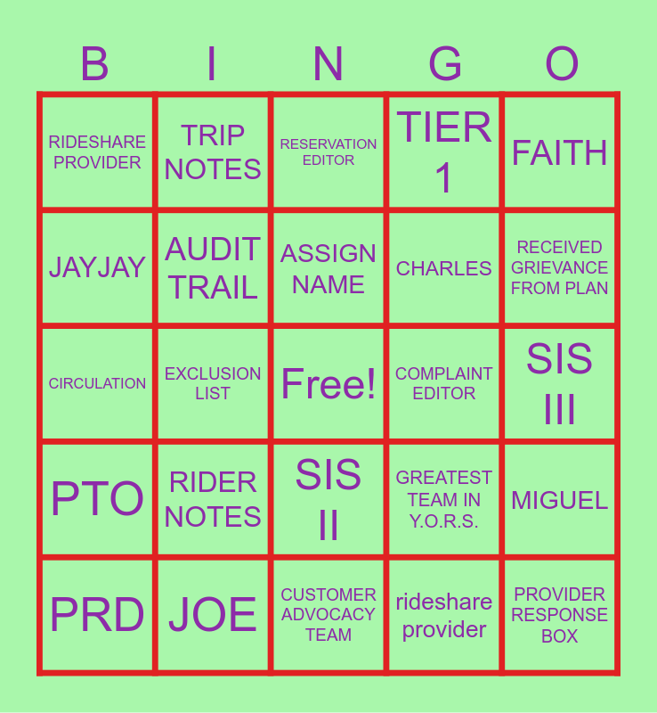 This bingo card has a free space and 25 words: RIDER NOTES, CUSTOMER ADVOCACY TEAM, ASSIGN NAME, PRD, FAITH, RIDESHARE PROVIDER, JAYJAY, TRIP NOTES, COMPLAINT EDITOR, SIS II, CHARLES, CIRCULATION, GREATEST TEAM IN Y.O.R.S., MIGUEL, AUDIT TRAIL, PRM, SIS III, RESERVATION EDITOR, RECEIVED GRIEVANCE FROM PLAN, EXCLUSION LIST, PROVIDER RESPONSE BOX, JOE, PTO, TIER 1 and rideshare provider.