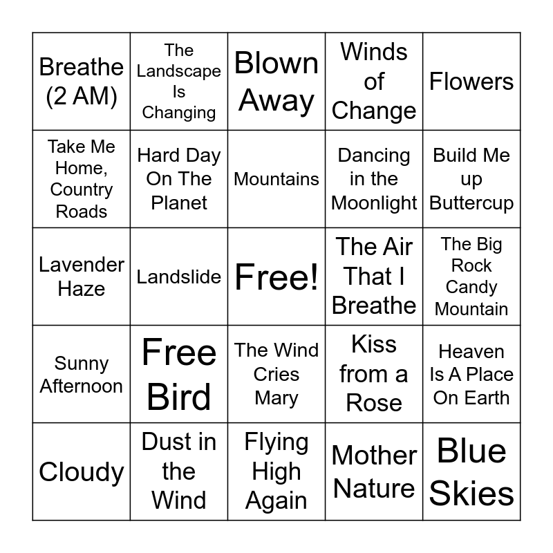 This bingo card has a free space and 70 words: All I Want Is You, The Big Rock Candy Mountain, Call Me The Breeze, Wildflowers, Dust in the Wind, Where Have All the Flowers Gone, Winds of Change, I'm Like A Bird, Flowers, A Rose by Any Name, Heaven Is A Place On Earth, Blowing Kisses In The Wind, Breathe (2 AM), Blown Away, Tornado, Landslide, The Wind Cries Mary, Dancing in the Moonlight, Wild World, Sunny Afternoon, The Air That I Breathe, Kiss from a Rose, Build Me up Buttercup, (What A) Wonderful World, Solid As A Rock, The Blackest Lily, Daffodil, Mountain Sound, Mother Nature, Poppies, The Landscape Is Changing, Like a Stone, Blue Orchid, Lotus Flower, Iris, Dandelion, Harvest Moon, Summer Breeze, Candle In The Wind, Take Me Home, Country Roads, Free Fallin', Free Bird, Blue Skies, Rocky Mountain Way, Against The Wind, Hard Day On The Planet, Cloudy, Rocket Man, Wind Beneath My Wings, She's Like The Wind, Desert Rose, Autumn Leaves, I'm a Lonely Little Petunia, She's A Rainbow, Flying High Again, Fly Away, Mountains, Feet On The Ground, Tree Hugger, Daisies, Lavender Haze, Peonies, Outside, Fly, Marigold, Airplanes, Windy, Tulips, Blue Bonnets and Camping.