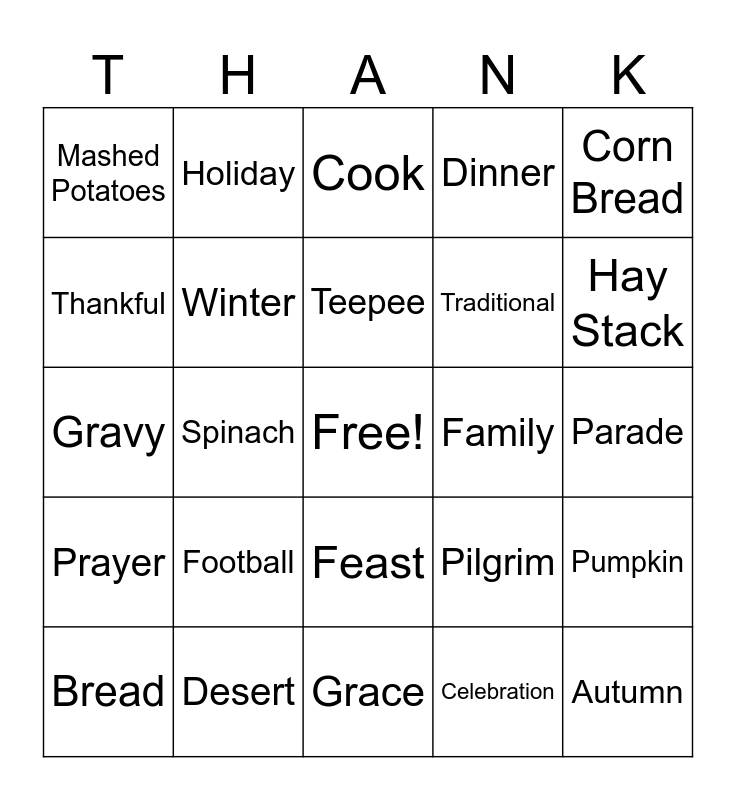 This bingo card has a free space and 45 words: Apple Pie, Autumn, Blessings, Bread, Calendar, Celebration, Cook, Corn, Corn Bread, Desert, Dinner, Family, Feast, Football, Gathering, Grace, Grateful, Gravy, Greetings, Hay Stack, Holiday, Home, Leaves, Mashed Potatoes, Mayflower, Parade, Pumpkin Pie, Pecan Pie, Pilgrim, Prayer, Prosperous, Pumpkin, Reunion, Seasons, Serve, Spinach, Squash, Stuffing, Sweet Potatoes, Teepee, Thankful, Traditional, Turkey, Winter and Yams.