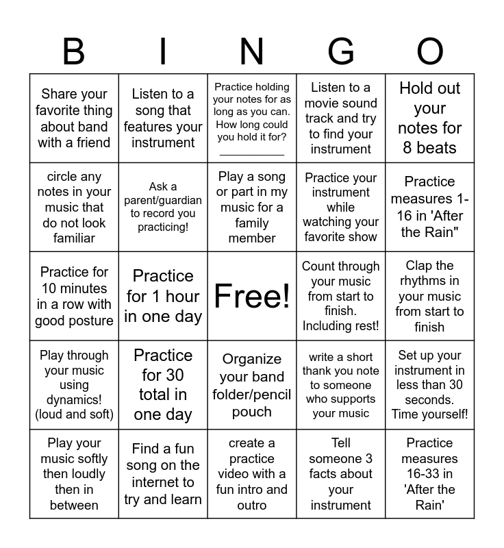 This bingo card has a free space and 24 words: Practice for 30 total in one day, Find a fun song on the internet to try and learn, Play a song or part in my music for a family member, Play your music softly then loudly then in between, Hold out your notes for 8 beats, Share your favorite thing about band with a friend, circle any notes in your music that do not look familiar, Listen to a song that features your instrument, Count through your music from start to finish. Including rest!, Organize your band folder/pencil pouch, Practice your instrument while watching your favorite show, Practice for 10 minutes in a row with good posture, write a short thank you note to someone who supports your music, Set up your instrument in less than 30 seconds. Time yourself!, Ask a parent/guardian to record you practicing!, Tell someone 3 facts about your instrument, Clap the rhythms in your music from start to finish, Practice holding your notes for as long as you can. How long could you hold it for?___________, Practice measures 1-16 in 'After the Rain", Practice for 1 hour in one day, Practice measures 16-33 in 'After the Rain', Play through your music using dynamics!(loud and soft), Listen to a movie sound track and try to find your instrument and create a practice video with a fun intro and outro.